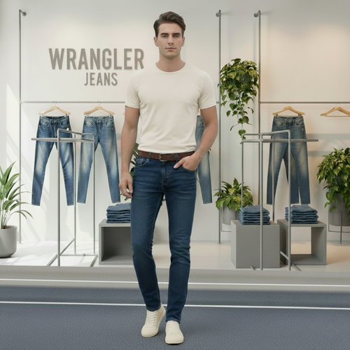 شلوار جین راسته مردانه نخ پنبه رانگلر رنگ آبی کاربنی نخ دوخت طلایی مدل JRP-ACT