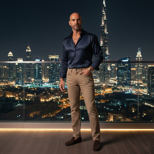 شلوار جین راسته مردانه نخ پنبه ام.ایگل رنگ آبی کاربنی نخ دوخت طلایی مدل P-AE-ACT