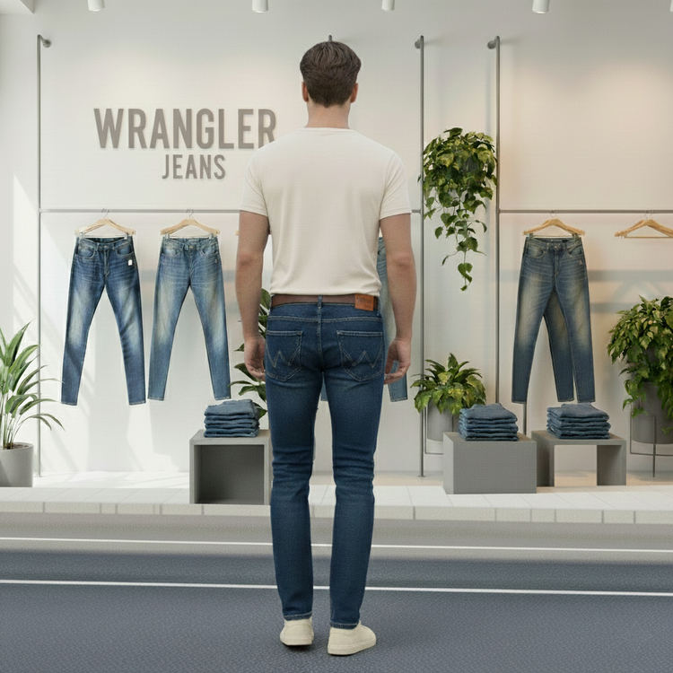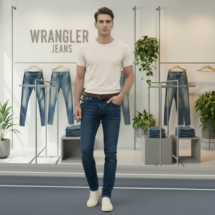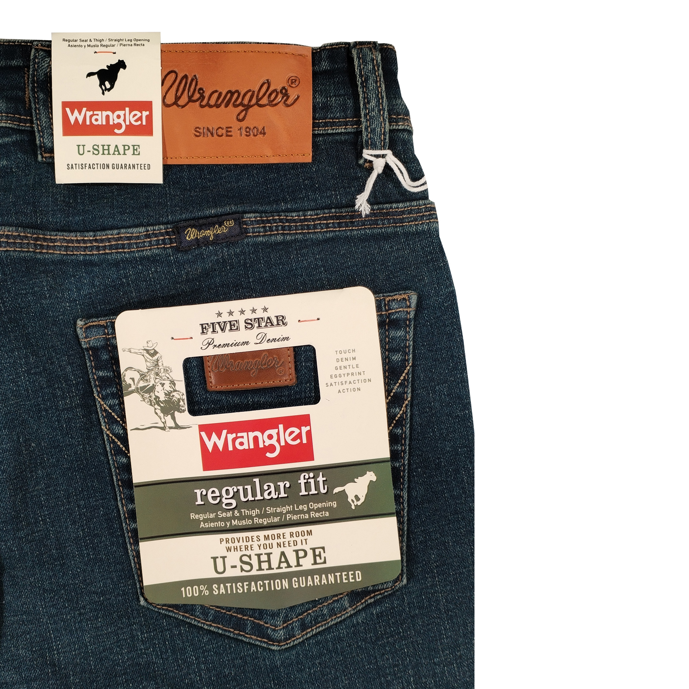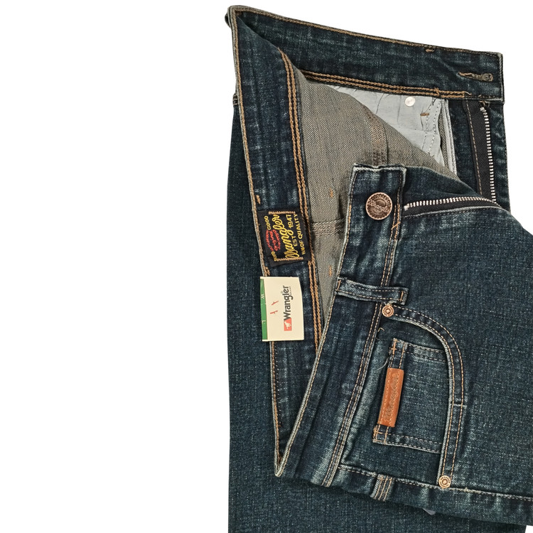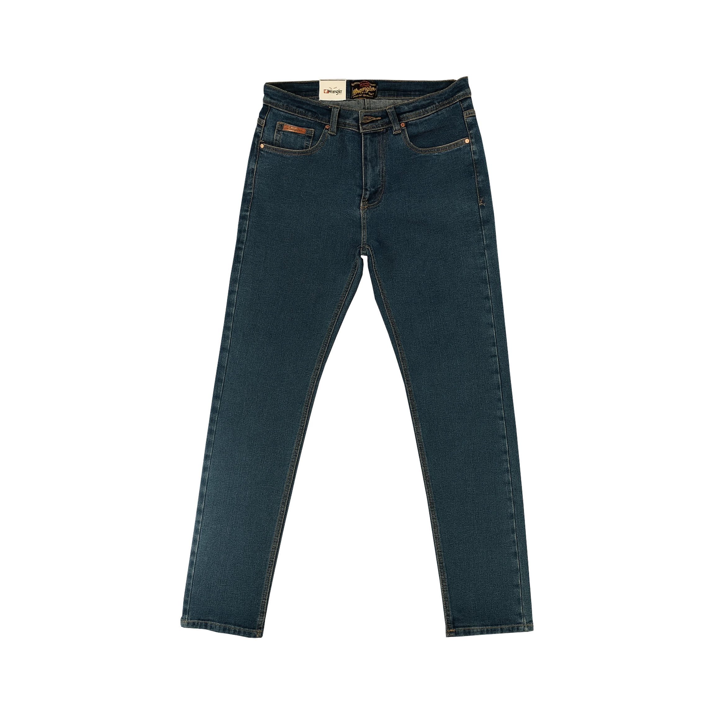 شلوار جین راسته مردانه نخ پنبه رانگلر رنگ اقیانوسی نخ دوخت طلایی مدل JRP-OT
